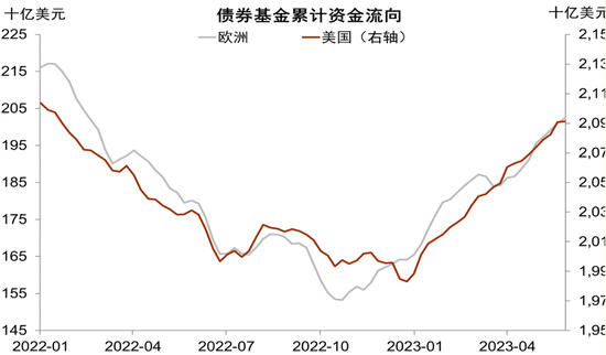 今年年初以来欧元区经济再次展现出不平衡的复苏,服务业保持强劲的同时制造业却延续了下行的趋势,值得注意的是,自5月以来,服务业也出现了一些见顶的迹象(图表30);不过夏季旅游旺季的到来应该还会继续支撑欧元区服务业至少在短期内保持强势;但与此同时,德国为代表的核心成员国经济却陷入了衰退(制造业对德国经济的拖累使得今年第一季度德国经济产出较此前一个季度下滑0.3%,这也是去年第四季度德国经济萎缩0.5%后的第二次走弱);而其他一些领先指标,比如德国IFO全国企业景气度指数与ZEW经济景气指数均已出现明显下行,而后者对欧元区PMI数据往往有接近半年左右的前瞻领先作用(图表31)。在此背景下,欧元区花旗宏观经济意外指数自今年2月以来开启了下行的趋势,目前已经跌至去年8月以来的低点附近(图表32)。我们认为,虽然制造业的趋弱可能会限制欧元区经济的复苏,但服务业在短期内的任性加之欧洲劳动力市场的紧俏(欧元区失业率正处于历史低点,图表33)可能依旧会支持ECB在未来的2次会议上继续其加息步伐,尤其考虑到能源价格的下跌可能会支撑消费有所反弹。此外,欧洲劳动力市场也依旧紧俏,工资增速目前已涨至历史高点,这就可能使得欧洲经济比美国更晚进入收缩。而市场对美联储降息预期的起点也可能早于对ECB的降息预期。另外,根据EPFR资金流向数据我们发现,欧洲股市在经历了1季度短暂的资金净流入之后再次开始转为净流出,而这也延续了本轮ECB开启加息周期以来的下行大趋势(图表34);待ECB下半年完成加息周期时,资金或许有希望重新回归欧洲股市进而对欧元形成一定支撑;而欧洲债市则跟随美国债市自年初以来持续吸引资金净流入(图表35);虽然ECB下半年加息空间比较有限,但如果目前的跨境债券投资的净流入趋势得以延续,这可能也将会为欧元提供一定的支撑。