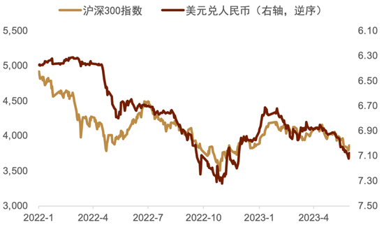 当前人民币市场情绪偏弱。人民币对美元的双边汇率运行在2022年11月末至12月初水平,彼时适逢陆续公布优化疫情防控的“二十条”[6]和“新十条”[7],以及有关部门为支持经济推出相应政策举措,在此情形下资产价格得到了明显修复。然而当时经济客观上仍处于探底阶段,现在的经济基本面情况较当时已有明显修复,然而国内股汇的定价却与彼时相当(图表20),这说明当前人民币资产价格计入了过多的悲观预期。