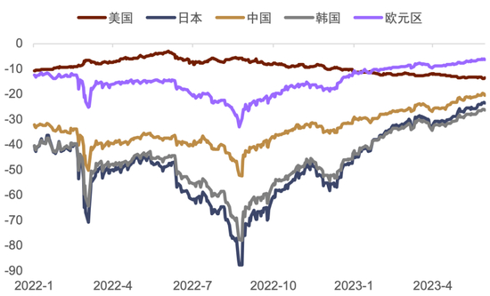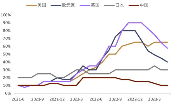 ► 当前欧元区、英国等地区/国家的通胀压力较大(图表7),且欧元区今年经济表现或好于预期。欧元区5月CPI同比6.1%,核心CPI同比5.3%,均小幅弱于市场预期,然而绝对水平仍然较高。我们判断欧央行货币政策转向节奏滞后美联储。这或为欧美利差的进一步收窄创造条件。欧盟5月的春季预测将2023年欧盟经济增长从2月的0.8%上调至1%[3],主要原因在于能源价格下跌引起的贸易条件改善。此外,尽管欧元区经济领头羊德国已连续两个季度陷入衰退,但德国联邦统计局指出,物价持续高涨对消费的压制是德国经济低迷的原因之一。