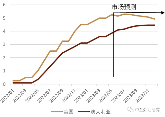 图表14:澳大利亚与美国政策利率走势与预期 (%)