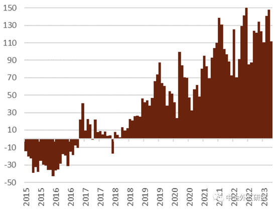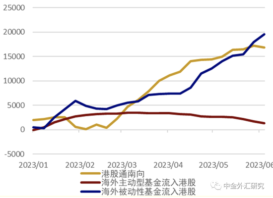 大量中国公司在港股上市,中国经济的强弱会左右境外投资者对在港上市中国企业的股票投资,进而影响港币汇率。中金宏观组认为下半年中国经济或重回典型复苏,当下最有效的宏观政策是宽财政,财政加码将减轻居民债务负担,增加其净资产,助力消费复苏,如果财政力度加大,我国重回典型复苏的亮点在于增长可持续提升,虽然复苏力度未必十分突出(详情参考《重回典型复苏—中国宏观2023下半年展望》)。2023年上半年,港股表现虽然相对不佳,但我们发现以港股通南向资金以及被动性海外基金依旧对港股呈现净买入的趋势(图表31)。2023年下半年,伴随中国经济重回典型复苏,海外主动型基金或加速买入港股,形成港币升值的力量。