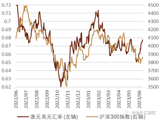 2023年上半年以来澳元汇率整体呈现出先强后弱的走势,1月期间在弱美元以及中国经济强势复苏的背景下澳美汇率上行至0.71并成为了最强货币;但2-3月期间在美元的反弹以及避险情绪的影响下澳元表现不佳一度跌至0.66附近;此后澳元基本处于震荡状态,5月末时受强美元等因素影响一度下行至0.65的年内低点,但此后伴随澳联储的意外加息澳美汇率恢复至0.67附近。整体而言上半年澳元相较美元贬值约1%,在G10货币中排名居中。此外,澳洲的经济同中国联动较大,今年上半年A股的相对疲软也是澳元难以走强的因素之一(图表10)。