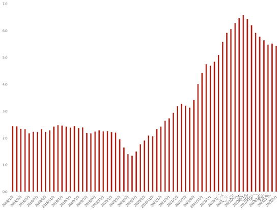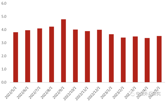 而在今年5月的议息会议上,英国央行上调了对23年年末通胀的预期至5.1%并且表示,如果服务业通胀或者薪资增速意外加大,那么BOE将会继续加息。而自5月会议以来,薪资增速基本符合预期但核心通胀却意外上行,这也就意味着,BOE可能不得不继续其加息周期。为了应对通胀,BOE已连续12次上调基准利率(从2021年12月份的历史低点0.1%,上升至今年5月份的4.5%),不过在近期通胀压力之下,市场预期BOE将在6月再次加息,而今年年内依旧有至少3次25基点的加息(OIS市场目前预计2023年加息终点利率上升至5.6%左右,这比市场对美联储在23年加息的终点利率高出至少约25基点左右,图表6)。鉴于我们对美联储下半年大概率结束本轮加息周期(甚至可能开启降息周期)的判断,我们认为英国央行更晚的结束加息周期可能使得英美利差整体上更有利于英镑。