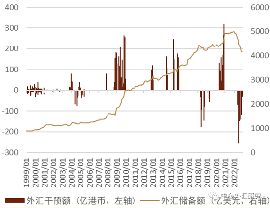 图表28:香港金管局的外汇干预与外汇储备 (亿港币)