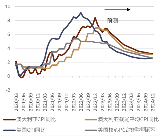 注:澳洲通胀为澳联储5月预测、美国核心PCE物价为美联储、美国CPI为彭博资讯统计的市场预测中位数