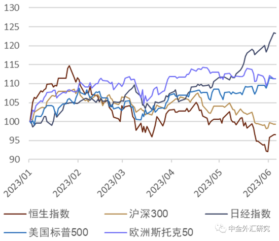 2023年初美元港币始于7.80附近,处于美元港币汇率区间的中枢,但此后受美港息差扩大的影响(图表27),美元港币间的套息交易有所增加从而形成了港币贬值的压力。因此在2-4月期间美港汇率基本都处在7.85的上限附近。为了稳定汇率,2023年至今、香港金管局实施外汇干预共8次、规模总计515.43亿港币(图表28)。然而进入5月之后,伴随美国加息逐渐步入尾声,卖出港币的压力有所减弱,同时在香港银行体系总结余跌破500亿港元后 (图表29),港元流动性的收紧开始对港元利率产生了正面影响,近期港币逐渐出现小幅升值,近期在7.83-7.84附近震荡。港美利差之外,年初至今港股的相对表现不佳(图表30),相关因素或为限制近期港币上涨的原因。