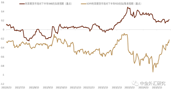 如下半年市场出现类似于今年3月美国硅谷银行事件的风险事件,那么瑞郎可能受益于其避险属性走出更加强盛的表现。另外,如果美国经济进入衰退的时间早于市场预期,或者陷入衰退的程度较深,那么市场对美联储降息的预期可能会提前,进而导致瑞郎可能会更大程度的受益于美瑞短端利差的收窄而出现更大幅度的上涨。