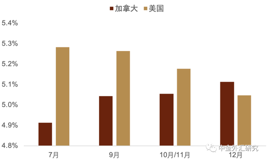 往后看,美联储和加央行的货币政策预期或更进一步走向收敛。美联储短时期内大幅度加息对于经济的滞后影响或将在下半年逐步显现,因此美国就业与通胀数据在下半年的走弱或意味着市场将逐步计入美联储货币政策的转向预期。加拿大今年迄今为止的经济数据表现都较为强劲,加拿大一季度GDP年化环比增长3.1%,超出市场预期,3月职位空缺率为4.5%[6],较去年年末4.2%的水平有所反弹,5月失业率为5.2%,较去年12月以来的5%小幅走高,然而仍处于历史相对低位,4月CPI同比4.41%,出现了小幅反弹,核心CPI同比则为4.11%(图表18),我们认为加拿大经济韧性上半年较强。OIS市场隐含的加拿大政策利率峰值约为5.1%,预计后续仍有逾一次加息(图表19),对应的是市场预计美联储后续加息空间不足一次,我们认为下半年美国与加拿大的货币政策或趋于收敛,进而推动美加利差收窄。