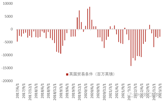 BOE在去年11月份曾经预测英国经济将在中长期出现轻度衰退,不过考虑到近期的一些积极因素,在5月份的议息会议上BOE将2023年、2024年英国经济增长预期分别上调至0.25%和0.75%。IMF也认为英国今年将避免衰退,并且预测今年英国GDP将增长0.4%,高于其在4月份预测的下降0.3%。而从目前的宏观经济数据来看,这样的预测似乎得到更多的支持:花旗宏观经济意外指数显示英国经济数据自3月以来一路上行,5月中旬一度已经涨至年内高点附近(图表7)(其中服务业PMI自年初以来一路走高至22年夏天以来的高点55附近,劳动力市场依旧较为紧俏,一季度基本工资增速从之前的6.6%升至6.7%,包括奖金在内的整体工资增幅保持在5.8%不变,这一水平也位于2022年以来的相对高点附近;1季度的失业率虽然从年初时的3.7%升至3.9%,略高于市场和英国央行预测的3.8%但依旧位于最近10年以来的低位附近)。另外,英国财政状况自去年3季度以来明显好转(图表8),而能源价格大幅走低带动贸易条件同样出现好转(图表9),这些也都支撑了英镑今年以来的走强。