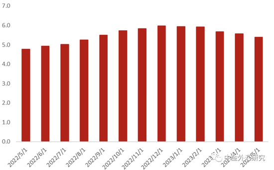 另外,根据6月1日发布的“Decision Maker Panel”调查(BOE密切关注的对英国企业CFO们的月度调查)显示[1],英国企业对未来3年的通胀预期自4月的3.4%升至5月的3.5%依旧处于高位(图表3),而这也明显高于BOE的目标2%。相对较好的消息是企业对未来一年价格增速的预期(近3个月均值)下降至最近一年以来的低点5.4%(图表4)。而对未来一年工资增速的预期(近3个月均值)也自前值的5.6%下降至5.4%(图表5),不过相比于BOE对工资增速的目标3%-3.5%依旧有一定的距离。而近期根据英国当地招聘中介indeed发布的最新数据显示[2],5月在indeed平台上发布职位招聘的公司支付的工资同比上涨7.2%,而这也是自2019年以来的最高增速(这也高于官方公布的今年一季度6.7%的工资增速)。