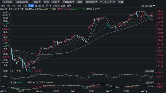 此前,6月26日,人民币对美元的在离岸市场双双走低,开盘即跌破7.20,随后继续下探,当日在岸报收7.2219,离岸报收7.2454。而在次日,在岸和离岸人民币汇率有所反弹,盘中陆续收复7.22、7.21关口,最终收盘在岸报7.2101,离岸报7.2239。