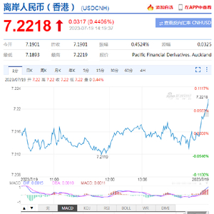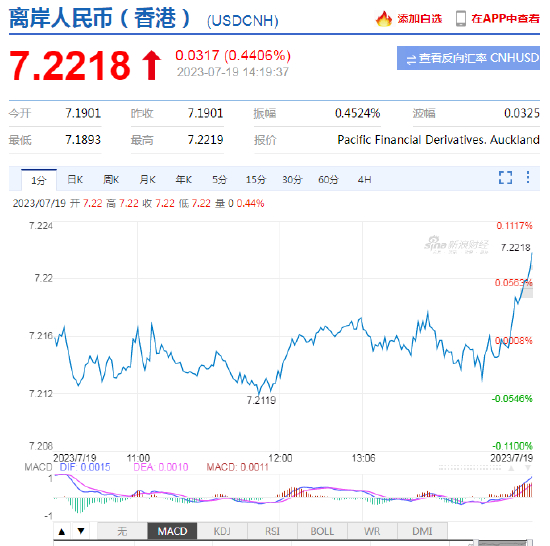 7月19日,美元指数短线快速拉升,离岸人民币跌破7.22,在岸人民币跌破7.21。