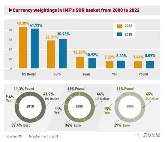R5可以以特别提款权SDR为基准,1个R5等值于1个SDR,并在此基础上浮动。图为SDR篮子各货币组成权重变化