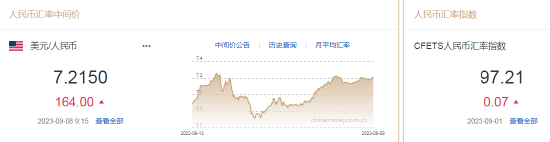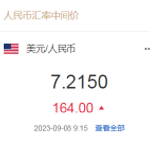 9月8日,人民币兑美元中间价报7.2150,下调164点;上一交易日中间价7.1986,上一交易日官方收盘价7.3279,上日夜盘报收7.3297。离岸人民币跌破7.36,日内贬值逾200点。