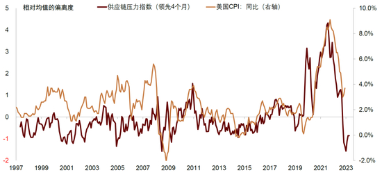 有两个短周期因素值得我们尤其关注。第一个是疫情冲击造成的全球范围内的供应链错配。一方面,人们长期居家生活办公,商品的需求大幅上升。另一方面,管控措施与工人不足对生产和物流造成极大干扰,商品供给严重不足。我们使用纽约美联储公布的全球供应链压力指数(Global Supply Chain Pressure Index, GSCPI)来衡量全球供需错配的严重程度。该指标使用多个主要经济体的运货时间与运费数据构建,指数越高意味着供应压力越大。如下图所示,供应链压力指数领先通胀走势4个月左右。2021年该指标快速升高到有数据以来的最高水平,通胀也随之急剧抬升。2021年疫情逐步缓和,全球供需错配格局并没有持续太久,供应链压力指数很快开始下降,带动美国通胀迅速回落。根据供应链压力指数与通胀的领先滞后关系,美国通胀下行还没有结束。与上述分析相互验证,美联储前主席Bernanke在2023年的量化模型中也提示供需错配造成的商品价格上涨是疫情期间通胀高企的主要原因[3]。
