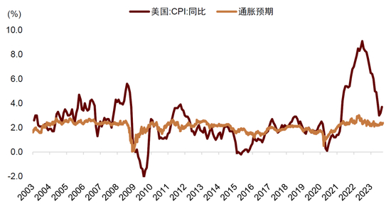 图表:美国通胀仅用一年左右就从9%回到3%,通胀预期维持相对稳定