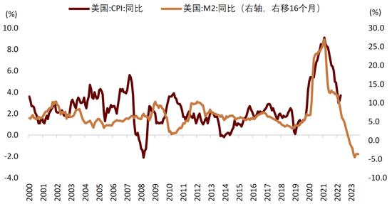 第二个短期周期性因素是史诗级的刺激性政策。为缓解疫情对经济主体造成的巨大压力,美联储2020年直接把政策利率降至零并重启QE。美国政府出台大量财政刺激,向居民与企业大范围发放流动性。这导致M2在很短的时间从6%快速扩张至27%,达到二战以来的最高水平。流动性扩张往往带来通胀压力,如下图所示,M2领先通胀16个月左右。当美联储意识到过度货币刺激可能导致通胀失控时,又在2022年启动了过去40年最激进的一轮紧缩,政策利率在不到一年半的时间里上涨超过500bp,M2增速快速压缩至负数。根据M2与通胀的历史关系,货币紧缩可能在未来继续转化为通胀的下行压力。