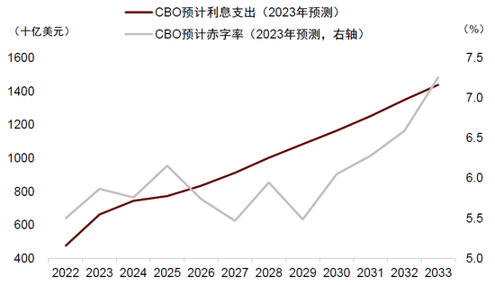 图表:如果利率居高不下,美国利息支出预计会在未来十年快速扩张