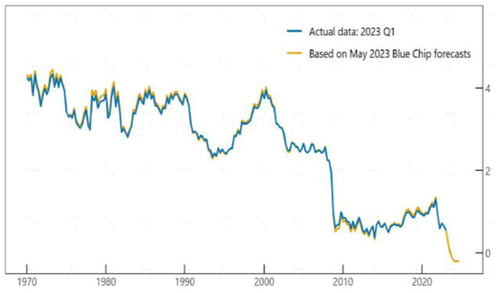 实际利率是通胀预期以外的另一个重要利率成分。从长期来看,实际利率的中枢是自然利率,反映潜在经济增速与生产率。考虑到疫情对经济生产的扰动,我们很难想象疫情后经济生产效率不降反升。相应地,我们也很难找到理由支持疫情后自然利率水平上升。美联储自然利率模型的创始人之一——纽约联储主席Williams——在2023年重新估计了疫情后的自然利率与潜在增速[5],证实了疫情后美国潜在产出较疫情前明显下降。至于自然利率,Williams发现当前自然利率水平并没有和疫情前有太大变化,仍然处在略高于0%的位置,甚至存在进一步下降到0%的风险。从自然利率的角度看,我们似乎仍然处在“低利率”时代,而非“高利率”时代。