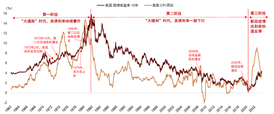 第一个阶段是1960-1980年,美债利率持续攀升,对应我们熟悉的“大通胀时代”。造成“大通胀”的原因很多,有两个因素尤为关键:首先,70年代以石油为代表的大宗商品价格暴涨,大幅推高通胀。其次,1973年美国放弃金本位,货币政策失去外部约束,长期通胀预期失控。为应对高通胀环境,美联储被迫连年加息,导致美债利率上行,即高通胀导致高利率。