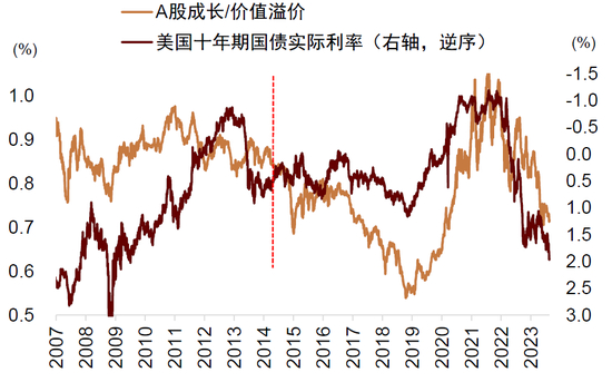 图表:A 股成长/价值溢价与美债实际利率负相关