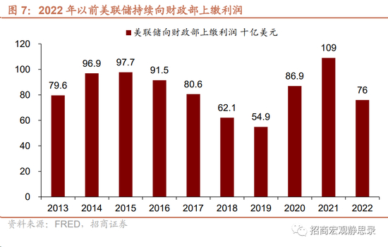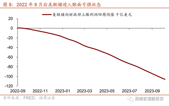 过去十余年,美国财政部和美联储配合的方法是:1)QE压低长端美债收益率降低利息支出成本;2)财政部付息给美联储的部分会得到大部分的返还(即“Remittances”,美联储收入在扣除运营成本和利息支付后,若有正向利润结余,需要全额转给美国财政部;若无,则将亏损记为递延资产),这就变相压低了债务利息支出成本。但从2022年9月开始,美联储进入亏损状态,递延资产总额已破1000亿美元。因此,美联储“打钱”给财政部的渠道难以为继。