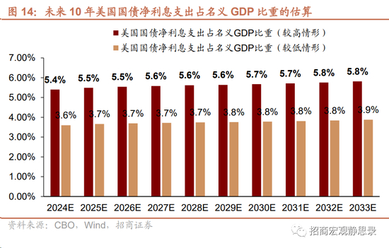 如图12所示,过去22年美国存量国债利息率与10年期美债收益率相当,但疫后这几年前者逐渐由高于后者变为低于后者。假定这种关系尚未出现质变(美国存量国债利息率在10年期美债收益率水平的0.8~1.2倍之间波动)且10年期美债收益率保持在4.5%中枢水平,根据美国国会预算办公室对美国名义增长与赤字率的估计,我们大致可以得到图13以及图14。即:假若美国国债利息率相当于10年期美债收益率的0.8倍,且净支出为总利息支出的80%,那么,未来10年美国国债利息净支出占名义GDP比重在3.6-3.9%区间。