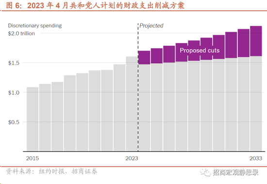 后续关于财政开支的博弈将愈演愈烈,但财政略紧、赤字率较今年小幅回落是大概率,尽管这一变化对于利息支出压力可谓杯水车薪。在4月29日前众议长麦卡锡提出的债务上限法案《限制、节约、增长法案》中,一方面,共和党希望未来10年将逐年加大财政支出削减力度,2024财年财政支出减少13%,并在未来10年年均削减18%;另一方面,共和党不希望削减医疗保险、社会保障以及国防开支,因此可动用的部分只剩下占比不到15%的非国防自主性支出。若要实现这一想法,非国防自主性支出各个项目需要减少51%,相当于今后10年的联邦财政开支削减4.5万亿美元。民主党显然无法接受这一方案,预计后续关于财政开支的博弈将愈演愈烈。