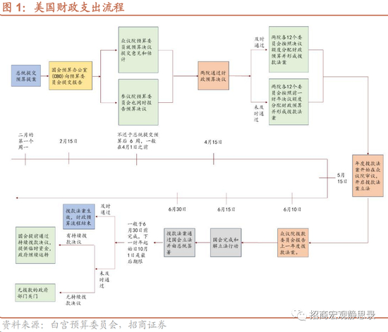 理论上,每年2月美国总统会提出新一财年(每年10月到次年9月为一财年)的财政预算提案,并由国会预算办公室(Congressional Budget Office,CBO)给出未来1年及10年的财政预算展望。参众两院预算委员会根据总统预算要求和CBO出具的报告,提出国会财政预算决议。预算决议是美国财政预算流程中一项需要在众议院和参议院通过(50票即可)的不具有法律约束力的两党共识,为该财年财政预算、委员会预算分配和预算变更提供额度限制,并可能对财政收支和债务限额变更法案提供和解流程指令。在预算决议通过后,国会两院将讨论通过最终的拨款法案,并交由总统签字生效。