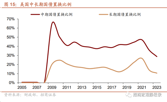 若以截至当前的今年平均利率水平(1年期美债5.06%、2年期4.55%、5年期3.99%、10年期3.86%、30年期3.99%),以及今年此前发行并在明年产生利息的美债期限(不到两年占比50.3%、2/3年占比18.2%、5/7年占比16.3%、10年占比7.7%、20/30年占比7.4%)为基准,那么今年发行的美国国债将在明年产生2170亿美元的总利息。考虑存量置换比例13.6%,用去年利息推算今年以前发行的国债也将在明年产生6136.8亿美元的总利息。此外,以今年年内滚动且年内到期的短债为基准以及5%的基准利率估计大约产生1000-1250亿美元总利息。结合图9,考虑明年美联储大概率无法继续返还利息,进而明年存量国债的净利息支出大约7445.4-7645.4亿美元,占名义GDP比重2.6~2.7%。2020-2022年该指标处于1.5%-1.85%区间,进而,只要保持目前高利率水平,每年存量债务置换率在13-15%,即便没有大规模新增债务,那么2025-2027年美国政府净利息支出占名义GDP比重也将升至3.1%-4.2%。