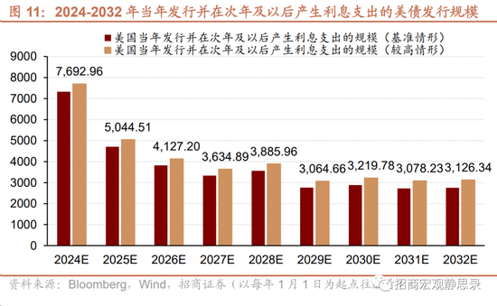 截至9月30日,今年美国新发行国债规模15.1万亿美元,已高于过去各年全年水平。当然,这是滚动发行规模,其中9.8万亿美元为26周及以内期限并已经(或者即将)在年内到期(同步产生兑付成本)。此外,Q4到期4.52万亿美元,预计总发行5.37万亿美元,考虑到今年此前发行的美债中40%是在10周及以内期限的,因此Q4的5.37万亿美元发行规模中在明年产生利息支出的规模或在3.22万亿美元。因此,今年发行并在明年(甚至此后)产生利息支出的美债规模约为8.5万亿美元。