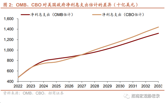 尽管美国总统提交的各财年联邦政府预算提案几乎不包含净利息支出这一分项,但CBO和负责统筹财政预算支出编制的美国行政管理和预算局(Office of Management and Budget,OMB)对强制性支出、自主性支出和净利息支出的金额均有预算估计,这也是联邦政府预算提案的重要参考。也就是说,尽管最终版本省略净利息支出,但财政支出制定过程给定净利息支出金额。从2013-2022年看,除2020-2021年外,OMB上报的净利息支出与联邦政府实际净利息支出误差在±5%以内。最新的预测显示,OMB和CBO对2024财年及以后净利息支出的估计差异在±10%以内, 2024财年及以后净利息支出占财政支出比重将逐年上行。不同点在于,CBO在2024-2026年更为保守,而在2027-2033年更为激进。