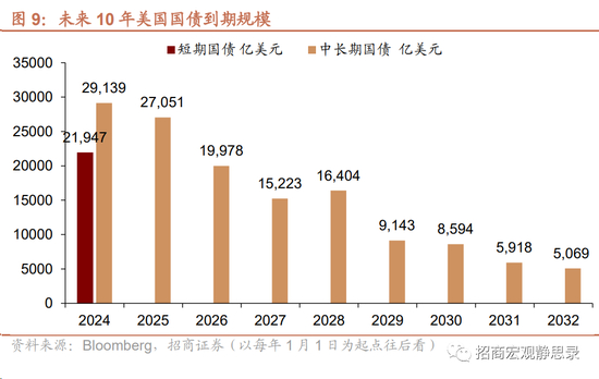 美国债务利息压力将在明年集中释放。如图9所示,当下往后看,2027年底之前有接近10万亿美元的中长期国债到期,而其平均发行利率不到2%,假若未来基准利率维持高位,则美国政府置换与偿付债务的压力显著上升,尤其是明后年(特别是明年)。