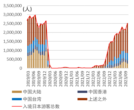 ②访日游客消费:我们认为入境日本旅游消费对今年的日本GDP或有1个百分点左右的提振效果。疫情前的2019年,来自中国大陆的游客消费金额占整体入境游客消费金额的约37%,而包含港澳台在内的该比例则高于55%以上。2023年10月数据显示来自中国大陆的游客仅占入境日本游客总数的约10%,远低于2019年全年的约30%的水平(图表10)。