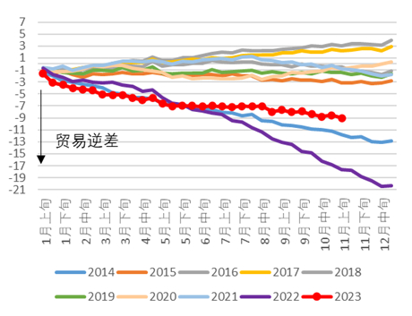 具体来看,10月社零总额同比与工业增加值均强于彭博一致预期,然而两项指标的两年复合增速较9月均有回落。一方面或体现10月季节性因素对生产造成一定扰动,另一方面消费动能有待提振。社融方面则结构欠佳,新增大部分由政府债券贡献,居民与企业实际融资需求偏弱。或体现政府加杠杆的同时私人部门债务扩张乏力。10月以美元计价的出口同比负增6.4%,弱于彭博一致预期的-3.5%和前值的-6.2%。不过出口同比的三个月移动平均依旧在上行。受欧美假期需求旺盛因素影响,11月和12月的出口金额有向上翘尾的倾向。经我们测算,若11月延续往年季节性表现(图表8),则11月出口同比增速有望转正。