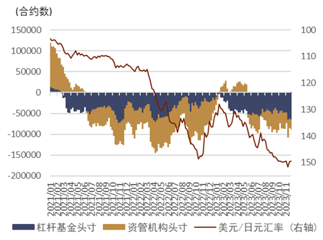 弱美元背景下日元逐步走强 11月期间美元指数明显走弱(图表28),在此背景下日元相较美元升值约2.35%,在G10货币与亚洲货币中都排名靠后,但是我们认为更需留意日元在11月末、12月初的边际上的变化,该期间内日元相对偏强,在G10货币中排名靠前。我们认为日元走强的主要原因来自于息差的驱动,尤其是美国短端息差定价的快速下行带来的美日12个月掉期点的变动。基于美日12个月掉期点的位置来看,日元汇率短期内或依旧存在升值空间(图表29)。此外,截至11月28日的日元头寸显示对冲基金与资管机构的净空头依然处于高位(图表30)、未来我们将观察边际变化。