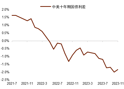 图表5:中美十年期国债利差倒挂程度减轻