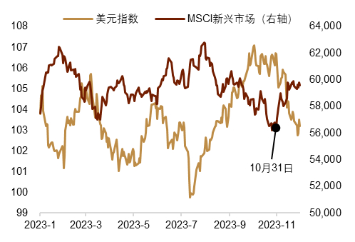 我们认为美国经济转弱为人民币汇率打开了升值窗口。因为市场预期美联储后续将更早降息后,美元利率开始持续走低。一方面,中美利差出现明显改善。美元利率下行直接推动了中美十年期国债利差(图表5)和USDCNY12个月远期点数在11月的明显走高(图表6)。另一方面,资金或从美国转而流往新兴市场国家市场。MSCI新兴市场指数11月上涨7.86%,涨幅创去年12月以来新高(图表7)。或有助于配置中国权益市场的跨境资金外流压力减轻。