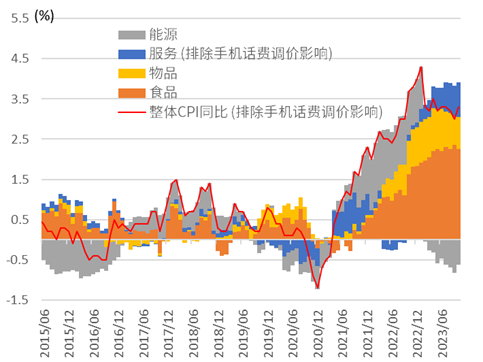 日本通胀反弹 日本10月综合CPI同比增长3.3%(预期3.4%、前值3.0%)、核心CPI(除去生鲜食品)同比增长2.9%(预期3.0%、前值2.8%)、核心核心[26]CPI(除去生鲜食品与能源)同比增长4.0%(预期4.1%、前值4.2%)。综合CPI同比再度反弹的主要原因来自于政府补贴减少所带来的电费价格上升。日本的CPI分拆来看,10月与9月相比,核心部分的物品与服务的贡献度依然维持在高位(图表31),我们认为未来日本的通胀同比或继续持平、同欧美的快速下行有所不同。在通胀高位停留的背景下,我们继续认为日本央行或在2024年1月退出负利率、并在2024年内开启连续加息(详情参考《中金看日银#34: 23年10月会议回顾-YCC的“废除”、2024年或连续加息》)。