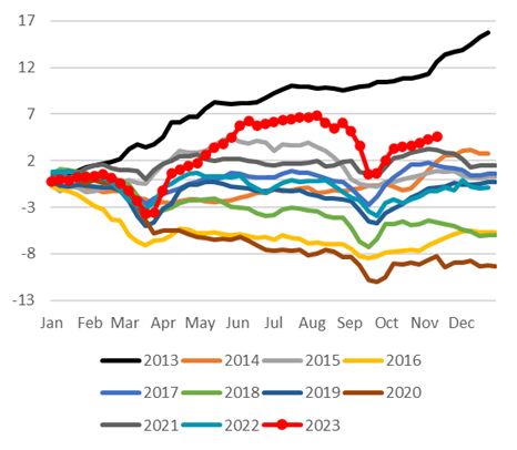 美国经济数据是否连续第二个月趋弱 美元指数在11月的下跌了约3%,基本回吐了9月以来的所有涨幅。我们认为美元转弱与弱于预期的10月美国经济数据有关。因为失业率的上行和通胀的下行都超市场预期,市场动摇了此前对于美联储将基准利率维持“更高更久”的预期。开始定价加息周期的结束,甚至定价美联储在2024年更早、更深幅度的降息。我们认为,转向交易能否在12月份延续,或将在很大程度上取决于美国经济数据的强弱。我们认为如果数据显示美国就业和通胀连续第二月趋软,那么美元指数或在年内仍有下行可能。