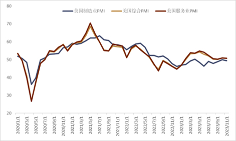 美国通胀继续放缓。10月美国CPI数据显示通胀压力继续放缓,CPI和PPI的同比增速均大幅低于前值(图表19)。而美联储青睐的PCE通胀指标显示,10月PCE指数同比上涨3%(低于前值的3.4%和市场预期的3.1%);剔除能源和食品后的核心PCE物价指数同比增长3.5%,同样低于前值的3.7%。不过,11月密歇根大学调查的未来一年消费者对通胀的预期意外创下最近七个月新高,较初值也出现了进一步的攀升:1年通胀预期终值录得4.5% vs预期4.4%,初值4.4%;而5年期通胀预期终值则录得3.2%,vs预期3.1%,初值3.2%。我们认为,如果11月的官方通胀数据继续有所回落,那么市场可能会更多的定价美联储明年降息的概率(市场目前预计明年上半年美联储会降息50基点左右)。