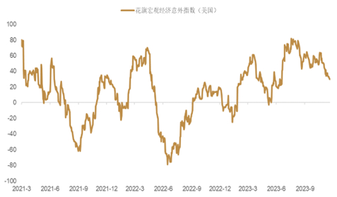 经济数据边际改善 以PMI数据为代表的欧洲经济数据在11月出现边际的改善(图表23),我们认为这或许暗示了下半年经济萎缩的风险有所缓和。总体看,德国PMI的意外好转有助于抵消法国PMI的意外走弱,而这也为欧元的走高提供了支撑。此外,德国11月IFO商业预期指数录得 85.2,虽然不及预期的85.8,但好于前值的84.7。而德国11月ZEW投资者预期指数的改善程度超出市场预期:从10月的-1.1升至9.8,而市场预期仅为5;这也是德国投资者预期指数连续第4个月录得改善,这或许也表明随着通胀的回落,欧洲最大经济体可能正在企稳。在此背景下,欧元区花旗宏观经济意外指数在月内明显走高(图表24)。向前看,我们认为如果欧元区经济可以进一步改善,那么市场或将预期ECB维持利率在当前水平更久,而这可能会对欧元产生一定支撑。此外,德国法院近期否决了财政支出案[22],这可能对德国经济造成利空进而限制欧元的走高幅度。