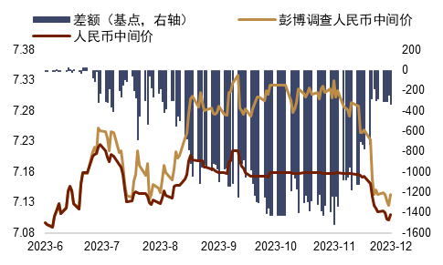 ► 中间价的信号令市场对人民币汇率预期转向升值。11月上旬人民币中间价在7.17-7.18的区间内窄幅波动,20日起开始连续调升,11月30日达到7.1018,回到6月初的水平(图表12)。由于美元指数与美债收益率汇率回落,11月人民币汇率所面临的外部压力缓解。然而中间价连续大幅向强方调整,或给市场释放了人民币进一步升值的信号。配合年末的结汇需求,市场主体或倾向于卖出美元。这推动人民币汇率在20日升值逾700点。中间价在月末则继续维持在7.10-7.12的区间内波动。目前中间价维持在较强水平,不过逆周期因子的调节力度已明显减小,或体现人民币即期汇率的绝对水平已回到较强水平。