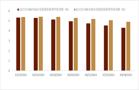 关注12月FOMC会上点阵图对未来利率路径的暗示。11月FOMC会议纪要显示[20],美联储决策者集体认为适合一段时间保持高利率,重申将谨慎行事;而美联储内部传统的鹰派官员近期有明显转鸽迹象(比如包括Waller在内的几位官员近期表态[21],12月会议上无需进一步加息);目前OIS市场对12月的FOMC会议也并未有任何的加息预期。我们认为12月FOMC会议有如下看点: