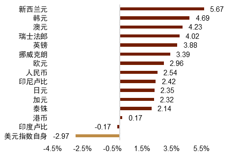 ► 美国通胀压力继续下行加之经济数据的走弱带动市场对美联储明年终点利率预期的下行,而美国经济数据的整体相对优势使得美债利率月内整体走高,美国与非美国家利差整体走窄支撑了美元的下行。