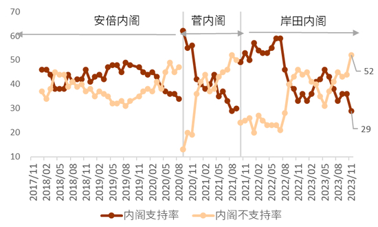 内阁支持率过去10年最低 NHK的民调[28]显示11月岸田内阁支持率由上月的36%降至29%,为过去10年以来的最低水平,同时内阁不支持率由44%升至52%,上升速度较快(图表32)。