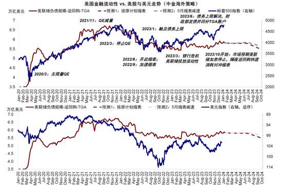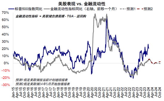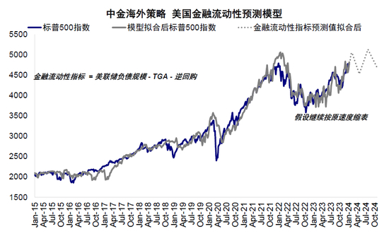 对于美股,金融流动性变化有直接影响,对走势和拐点有较好的预测性。1)假设美联储继续缩表:当前逆回购还有1万亿美元,美国财政部在2023年11月给出的2024年一季度发债计划中预计净发行4676亿美元短债。按近期逆回购承接比例90%计算,一季度可能回落4200亿美元,仍可对冲同期接近3000亿的缩表规模。不过进入二季度,美债短债发行规模明显放缓,将使得逆回购释放速度放缓,金融流动性将开始收缩。基于金融流动性和标普500同比的紧密关系,美股二季度或有回调压力,幅度在5-8%,随后降息影响下再逐步修复。2)若美联储5月放缓缩表:根据上文测算,将对冲流动性下行速度,因此也有助于对冲美股压力。