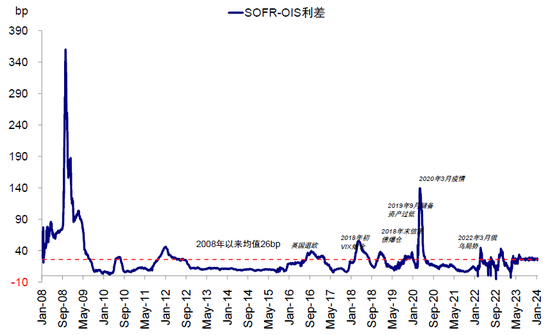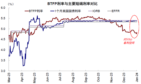2)BTFP即将到期,无法提供“便宜”融资。BTFP(Bank Term Funding Program)是美联储为应对中小银行风险设立的长期贷款工具,提供以证券面值抵押的1年期贷款,利率为1年OIS+10bp,该计划暂定2024年3月11日结束。目前BTFP使用规模为1615亿美元,虽然规模远小于逆回购,但可能因为存在套利空间,近期规模仍在持续增加。由于降息预期,1年期OIS利率快速下降,银行可通过更低利率(4.87%)从BTFP获取资金再放到准备金或购买债券(5.3%~5.4%)套利。加上当前各类银行间流动性指标都已经稳定,因此BTFP继续存在的必要性也在下降。