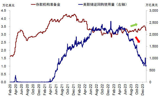 缩表速度如果过快可能造成金融流动性压力,2019年就是一个前车之鉴。近期触发市场认为美联储可能考虑减速的契机,一是逆回购规模的快速下滑,意味着缓冲垫变薄,我们测算4月左右可能基本“耗尽”,届时将无法对冲缩表。二是去年因中小银行危机推出的BTFP工具即将到期,当前BTFP使用规模远小于逆回购,但存在银行从BTFP借钱投资于短债的套利空间,且各项流动性指标已经稳定,该工具继续存在的必要性不高。
