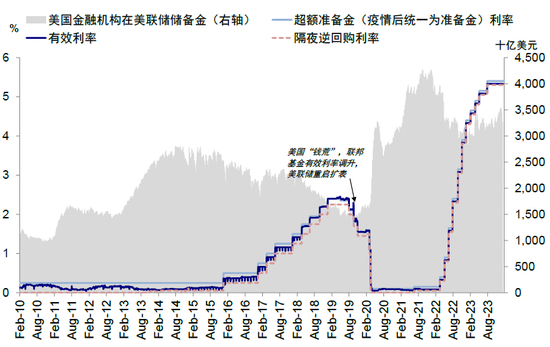 既然降息短期不太可能出现更大超预期变化且小幅的变动也影响有限,缩表进程的调整更值得关注,也会通过金融流动性直接影响美股表现,这一指标近几年在判断美股拐点上起到较好效果(《金融流动性还能支撑美股多久?》)。1月初达拉斯联储主席洛根将缩表减速预期带入投资者视野[1],12月FOMC会议也显示[2]美联储官员已经关注缩表进程。本文中,我们将探讨几个问题,为何会调整缩表进程、调整依据是什么?何时可能、又如何影响市场走势?